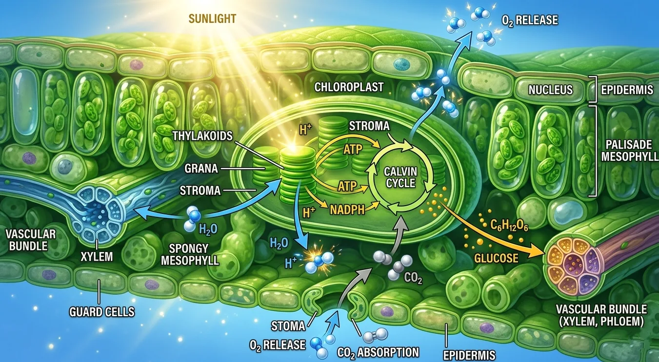 O processo de fotossíntese ocorre dentro de organelas especializadas chamadas cloroplastos, presentes principalmente nas células das folhas. Imagine os cloroplastos como pequenas fábricas verdes espalhadas pelo interior da planta.
